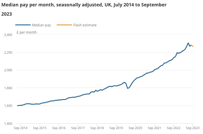 Figure 3: Median pay per month, seasonally adjusted, UK, July 2014 to September 2023