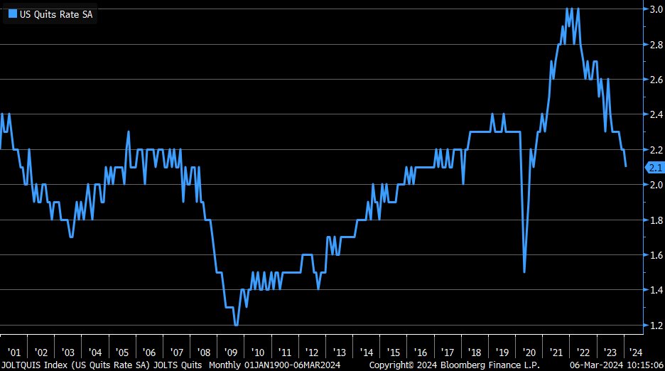 As you can see from the chart, the quits rate (resignations initiated by employees as a percentage of total employment) has dropped significantly from the peak levels of early 2022. In fact, at 2.1% in January 2024, it's back around pre-pandemic norms.