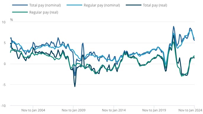 Total earnings growth, including bonuses, came in at 5.6% for the November 2023 to January 2024 period.