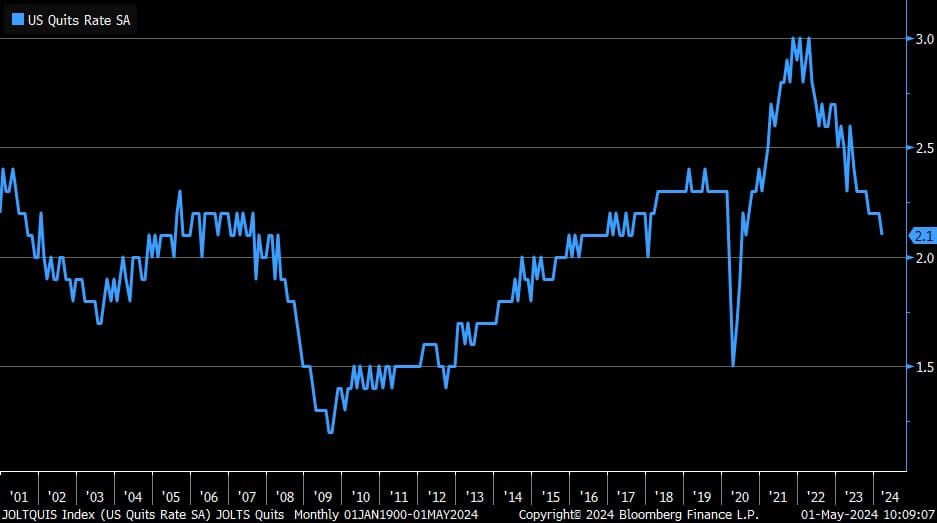 Quits rate was 2.1%, signaling steady worker willingness to leave jobs. The quits level dropped by 480,000 over the year.