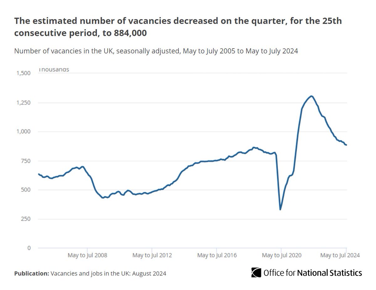 Vacancies decreased by 26,000 in the May to July 2024 period, totaling 884,000.